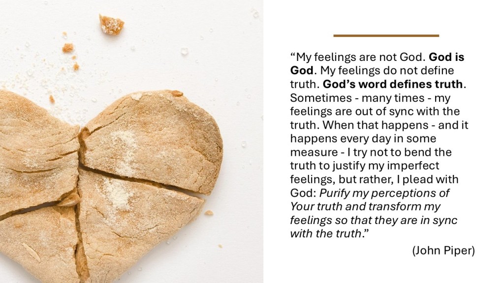 Let’s acknowledge before God when our feelings are out of sync with His word. Let’s ask for the strength to resist the urge to bend truth to our will, and instead, plead for God to purify our perceptions. May our prayer be, “Lord, transform my feelings so they reflect Your truth, not my own desires.”