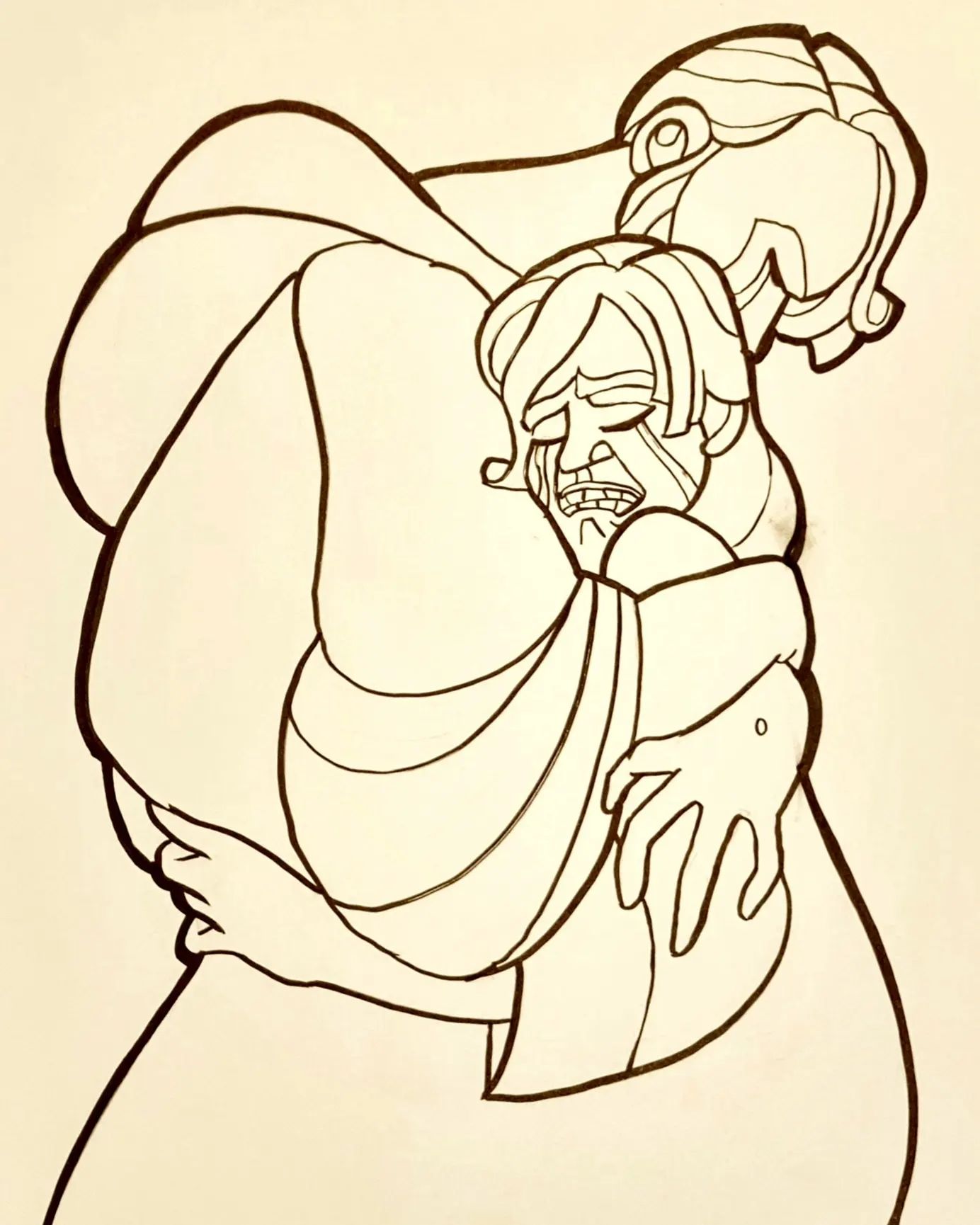 In the drawing I used the lines to depict presence and shared pain. The woman’s lines and Jesus’s lines flow into and out of each other in this moment of untold and unspoken grief.