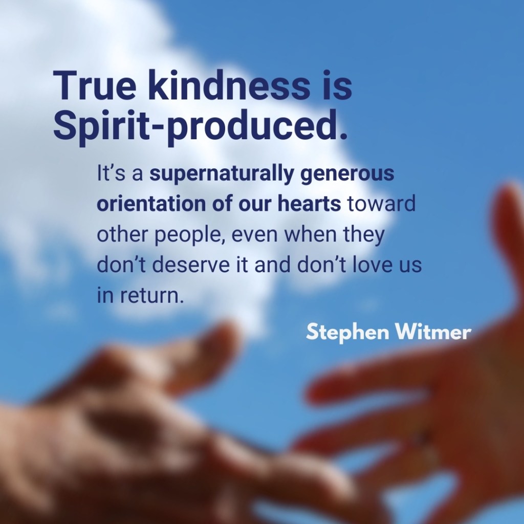It’s no surprise, then, in contrast to the acts of the flesh (which include hatred and fits of rage, Gal 5:19-21), Paul writes, “The fruit of the Spirit is … kindness” (Gal 5:22). Spirit-formed kindness is more than simply being a nice person. It means intentionally showing kindness to others, even when they don’t deserve it. It is a kindness that gives people a foretaste of heaven, a glimpse of the majesty and beauty of Jesus.